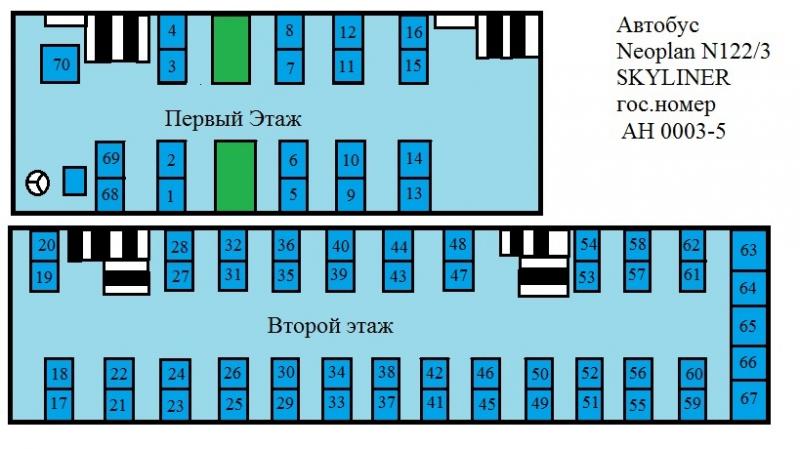 2004 года, двух этажный, ЕВРО-3, 70 пассажирских мест, 8 TV, DVD, MP-3, NAVI, аудиосистема, микрофон, климат контроль, кондиционер, WEBASTO, 2 стола, откидные столики, подножки, микроволновка, 3 люка, холодильник, тонированные стекла, 220V для зарядки телефонов. |